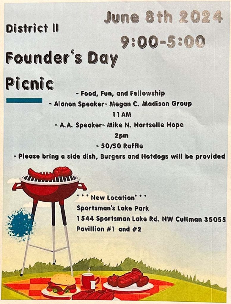 The District 2 annual Founders’ Day Picnic will be on that date but will also be in a new location. For the first time in many years, it will NOT be at Rickwood Caverns. Instead, it will be at a more central location: Sportsman Lake in Cullman. Click that link to see all the details, including a picnic area map.