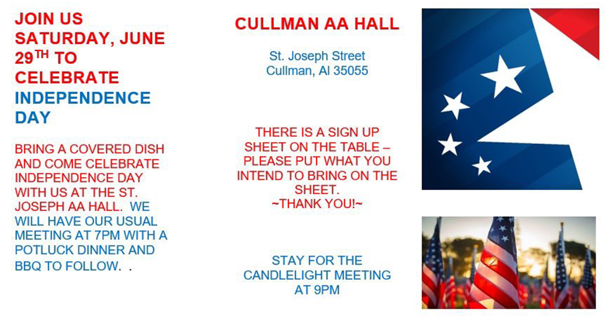 Cullman Group 4th of July Celebration June 25, 2024 By District 2 It’s happening on Saturday, June 29th. Don’t miss it. And bring a dish—meeting at 7 PM, Barbecue, and potluck to follow.